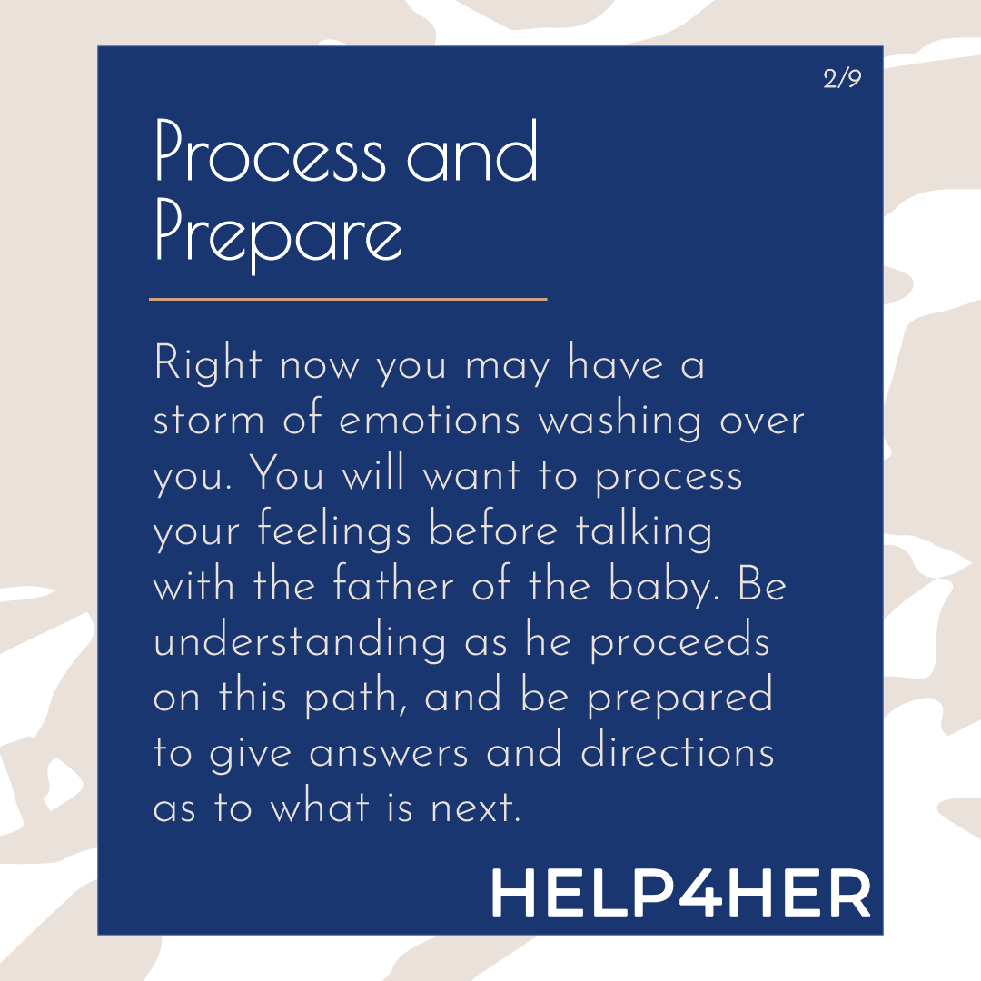 Right now you may have a storm of emotions washing over you. The feelings of shock, denial, anger, and grief can be overwhelming. These are natural. You will want to process your feelings before talking with the father of the baby. This journey of grief over the loss of innocence and the weight of the new reality you find yourself in can be perilous.