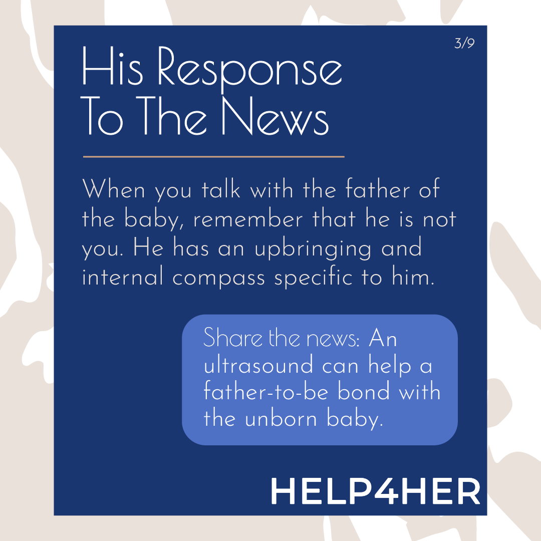 Every pregnancy story is as unique as the individuals who comprise them. When you talk with the father of the baby, remember that he is not you. He has an upbringing and internal compass specific to him. He is male. Depending on his age, he will develop emotionally at a separate pace than you. He is not pregnant. The physical and emotional reality of the pregnancy is much more personal to you. This does not mean he does not care or is incapable of empathy and concern. It means that his response to the news and the journey of the pregnancy will be his own.