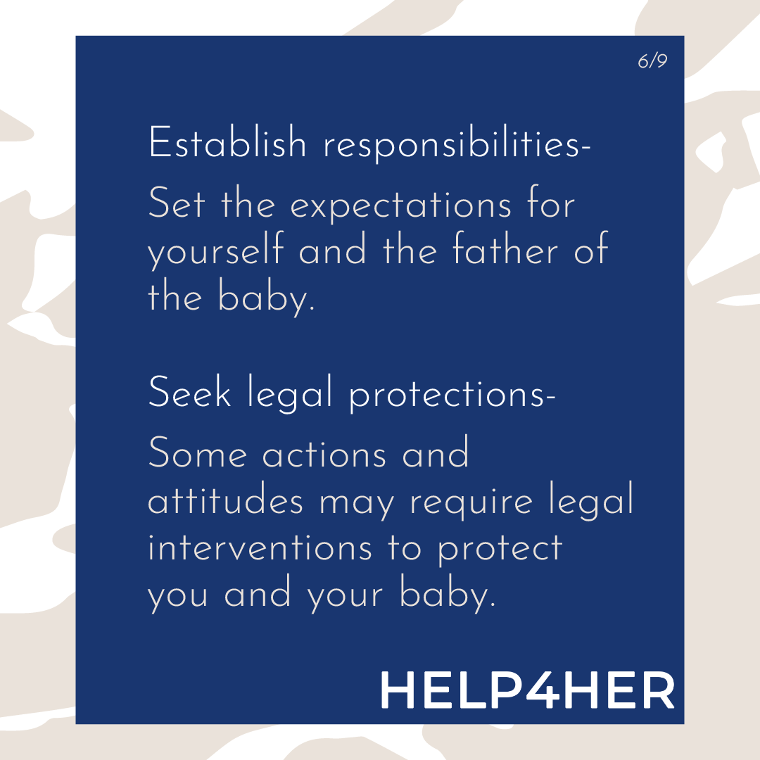 Establish responsibilities - the birth and care of a child will involve many responsibilities. Set the expectations for yourself and the father of the baby. Unspoken expectations will lead to disappointments, frustrations, and anger.