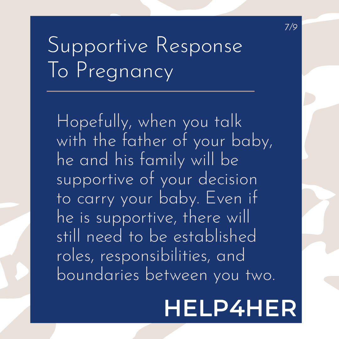 Hopefully, when you talk with the father of your baby, he and his family will be supportive of your decision to carry your baby. Even if he is supportive, there will still need to be established roles, responsibilities, and boundaries between you two. Clear expectations will help prevent interruptions in your relationship. Work to foster a positive relationship with the father’s family. They will be grandparents soon, and you can expect them to be part of your child’s life in the future.