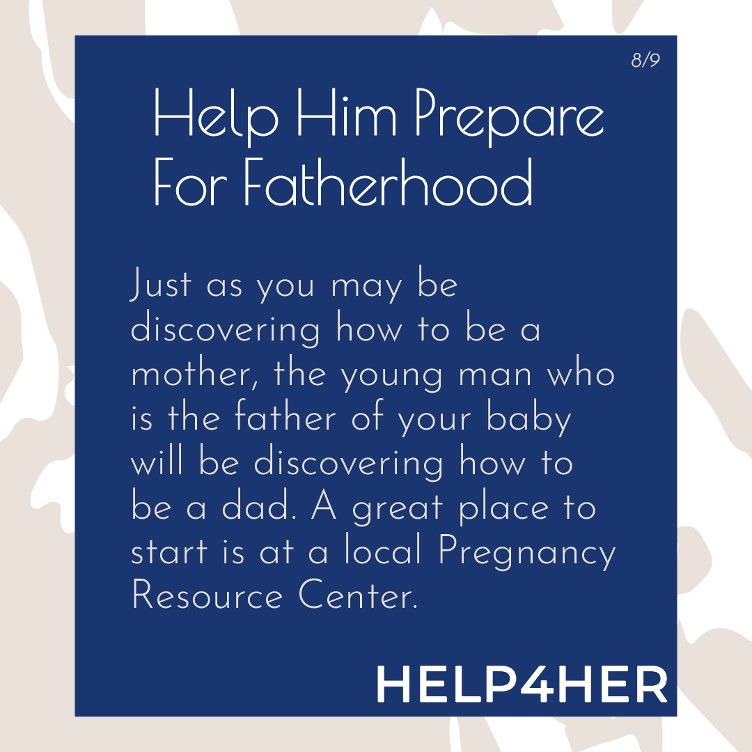 Just as you may be discovering how to be a mother, the young man who is the father of your baby will be discovering how to be a dad. A great place to start is at a local Pregnancy Resource Center.